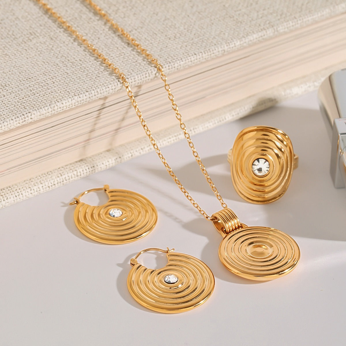 Smykkesæt til kvinder 18 karat forgyldt - Rund med tekstureret design halskæde øreringe ring