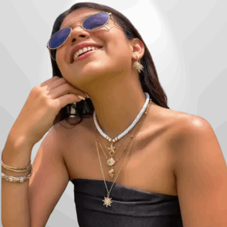 Opdag vores halskæde i havinspireret stil med et lagdelt design. Kombinerer guldkæder, perler og vedhæng med søstjerner og muslinger. Perfekt til kvinder, der elsker en havinspireret stil!