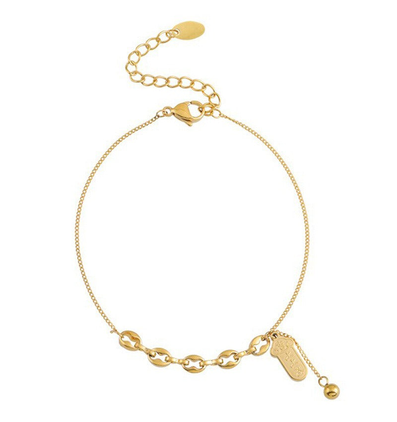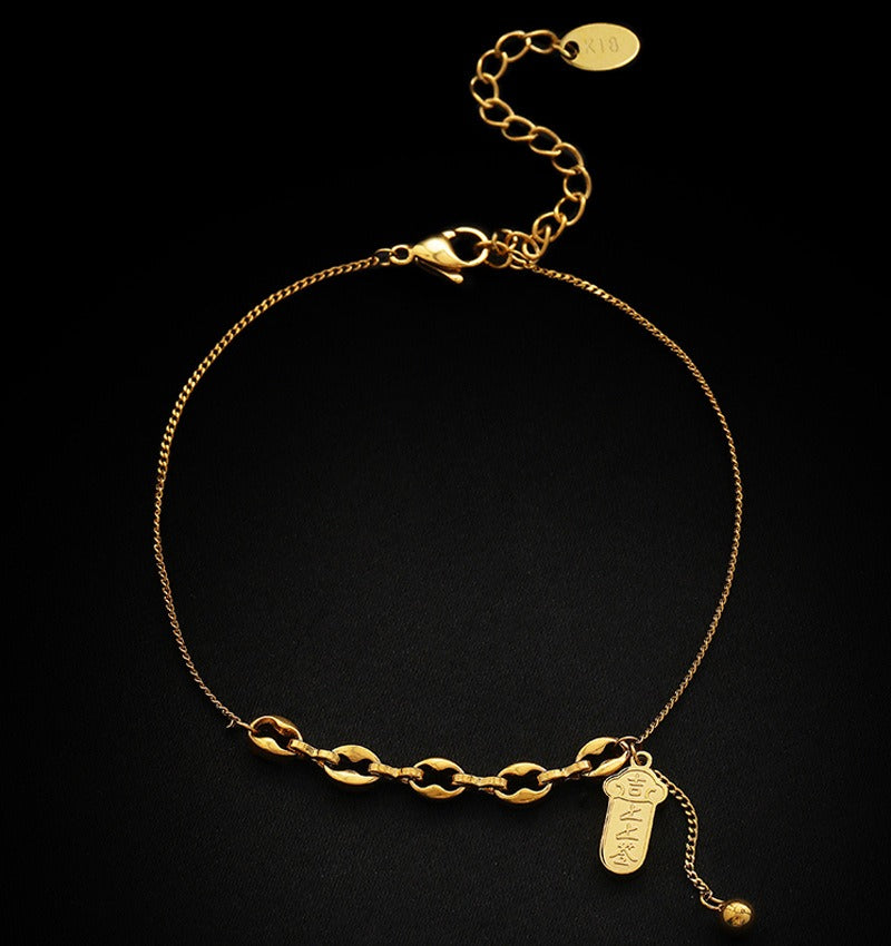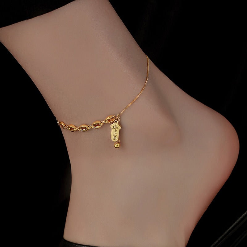 Dette 18K gullpletterte titanstål anheng ankelsmykket kombinerer perfekt et delikat anheng med holdbart materiale. Dens enkle og stilige design utstråler en touch av luksus, noe som gjør det til et ideelt valg for både daglig bruk og nisje-stiler.