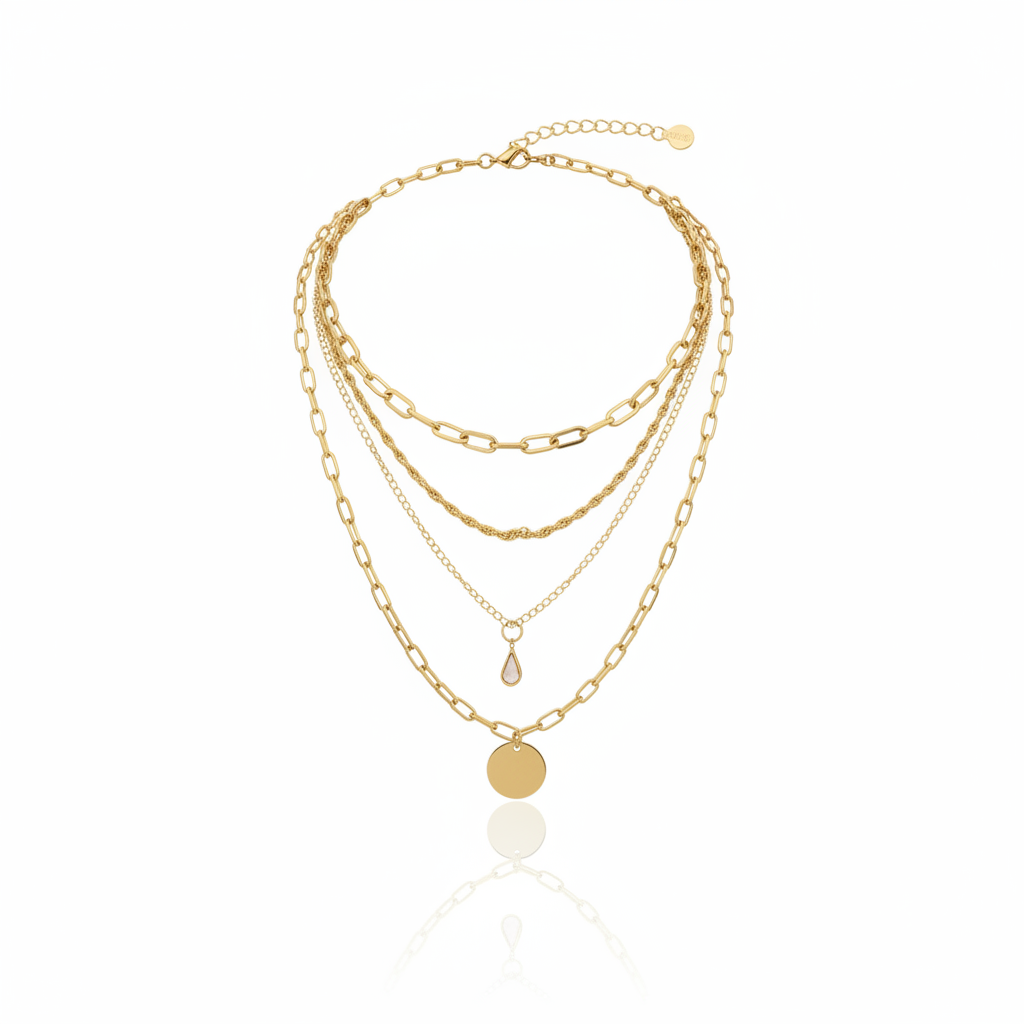 Denne halskjeden representerer det beste av moderne smykkedesign. De geometriske anhengene - både runde og dråpeformede - skaper en visuell harmoni som tiltrekker oppmerksomhet uten å være overdrevet. Det flerlags designet gir en luksuriøs følelse som er perfekt for både hverdagsbruk og spesielle anledninger.